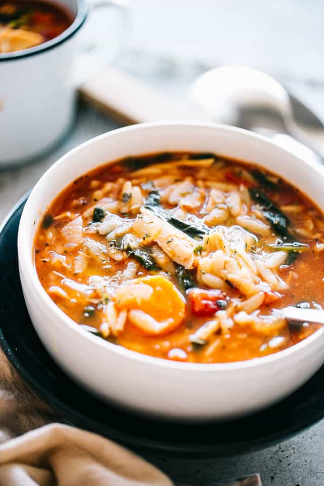 Sopa deliciosa y abundante, rica en tomates, espinacas, fideos de cebada y carne de pavo.