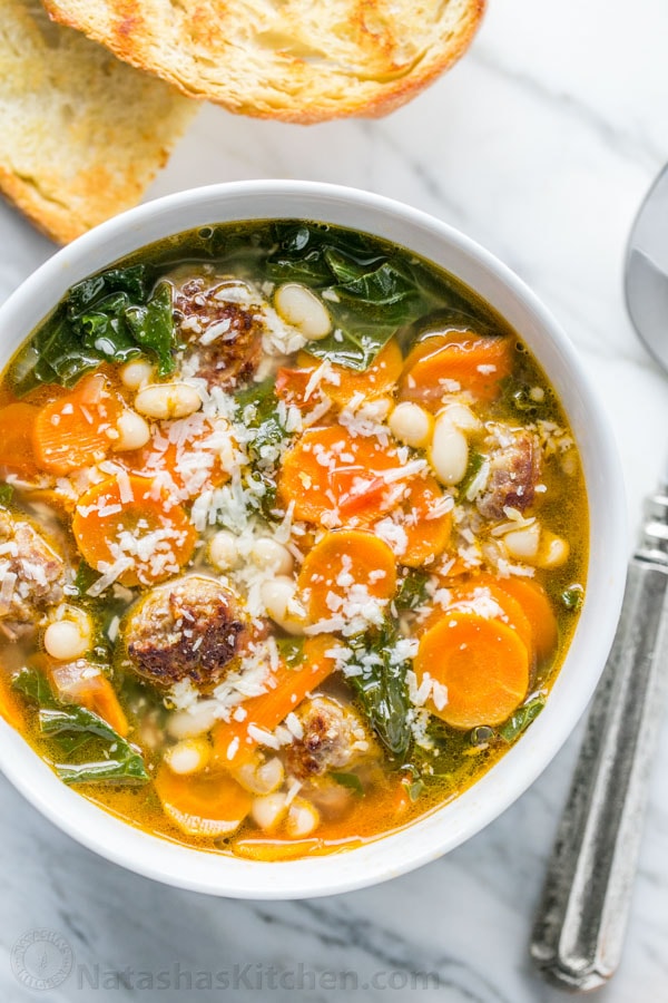 Tenía algunos ingredientes similares en el refrigerador y después de haberlo hecho dos veces esta semana, no pude resistirme a compartirlo contigo :). Me gusta la idea de usar salchichas crudas en lugar de las cocidas porque puedes cortarlas fácilmente en albóndigas e infundir la sopa con un sabor maravilloso. Y el parmesano: no te lo saltes. Marido guapo – ¡Adorable! 🙂
