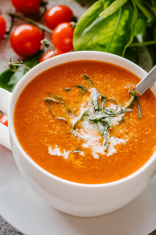 La abundante y aterciopelada sopa de tomate asado combina los sabores del tomate fresco de la huerta, la albahaca y el ajo. Hecha con solo unos pocos ingredientes, esta receta de sopa de tomate es mucho mejor que la versión enlatada, ¡y no podría ser más simple!