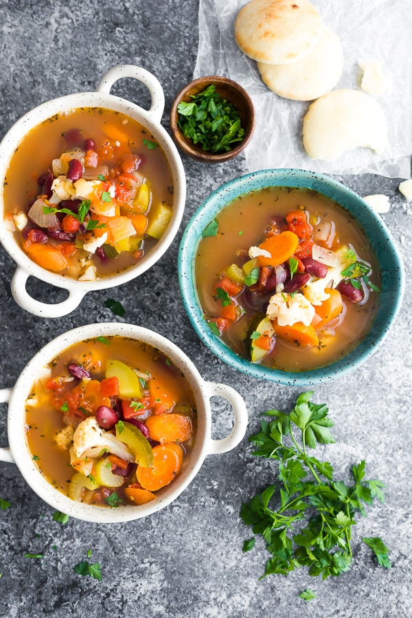¡Esta receta de sopa de verduras está repleta de verduras y sabores saludables! Con zanahorias, apio, coliflor, calabacín, tomate y frijoles.