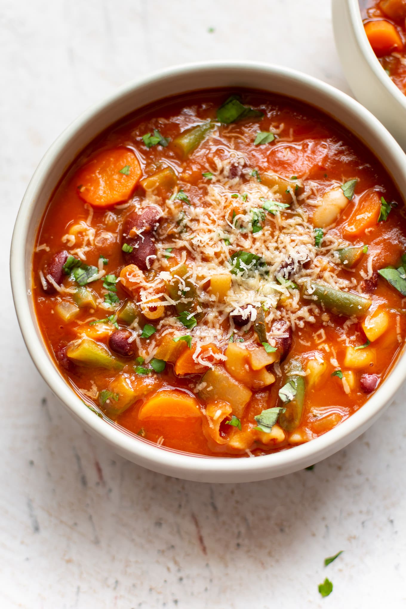 Minestrone es una sopa de verduras italiana espesa y sabrosa que generalmente contiene pasta y caldo a base de tomate. ¡La considero la madre de todas las sopas de verduras!