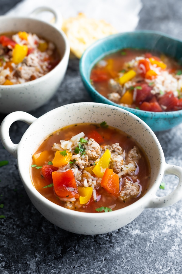 Esta receta de Sopa de pimientos rellenos es muy fácil de hacer. Usé pavo molido, pero puedes usar cualquier carne molida que te guste (o dejarla fuera para una opción vegetariana).
