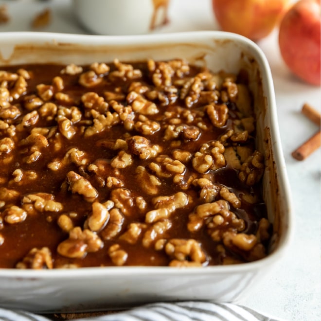 Inspirado en el famoso Houston’s Restaurant en Austin, Texas (ahora conocido como Bartlett’s), este Apple Walnut Cobbler es como una tarta de manzana al revés porque así es exactamente como se prepara. Las tartas de manzana horneadas están cubiertas con una rica salsa de caramelo que se ha acentuado con nueces que agregan una textura crujiente y un sabor a nuez.