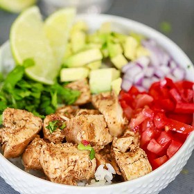 Si bien la receta requiere pechugas de pollo, puede sustituirlas fácilmente por muslos de pollo o incluso por una mezcla de ambos. Los tazones de pollo y los burritos solo serán tan buenos como decidas prepararlos.