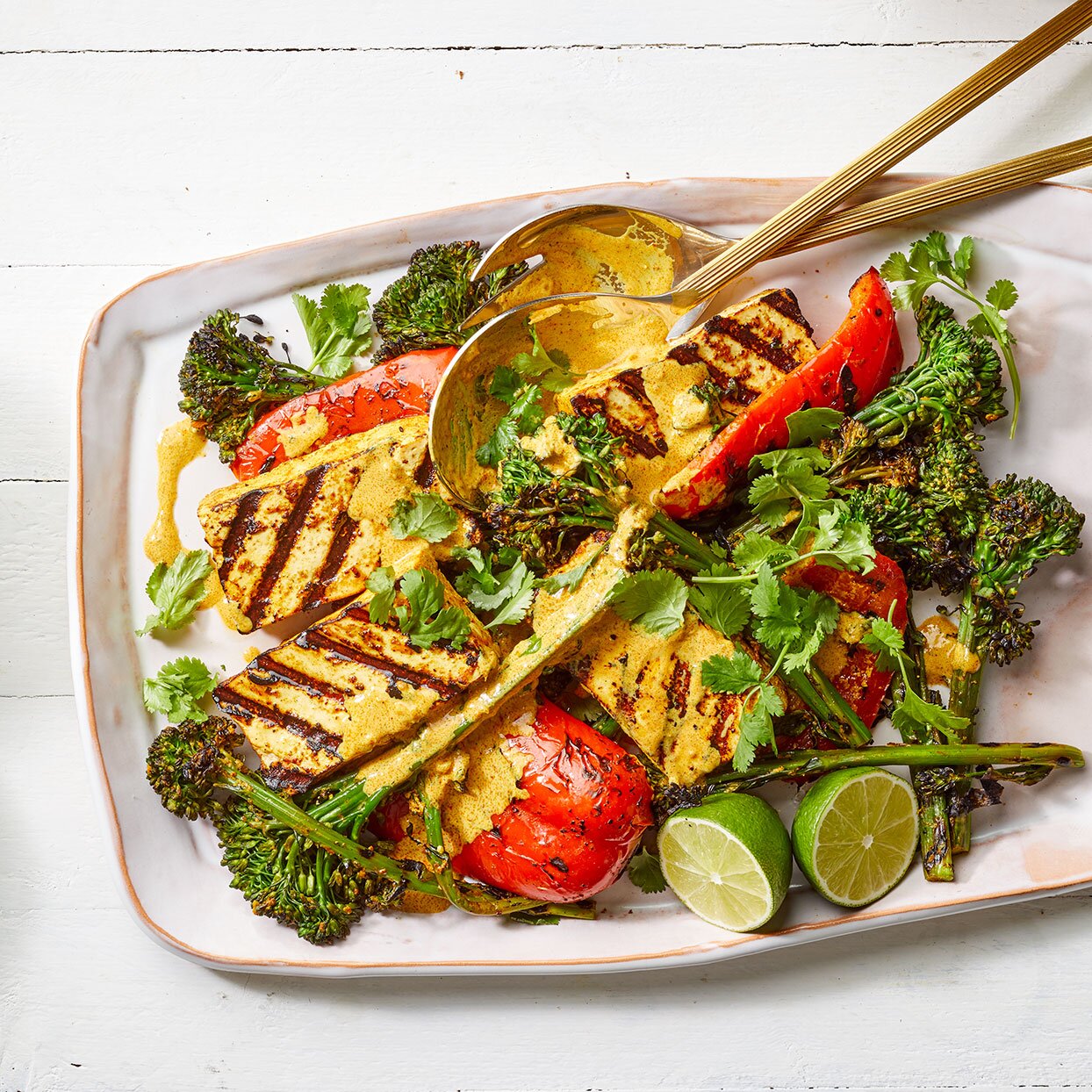 Engrasa la parrilla. Asa el tofu, el brócoli y el pimiento, volteándolos por la mitad una vez, hasta que estén ligeramente carbonizados, de 6 a 10 minutos. Rocíe con la salsa reservada y sirva con cilantro y rodajas de limón, si lo desea.