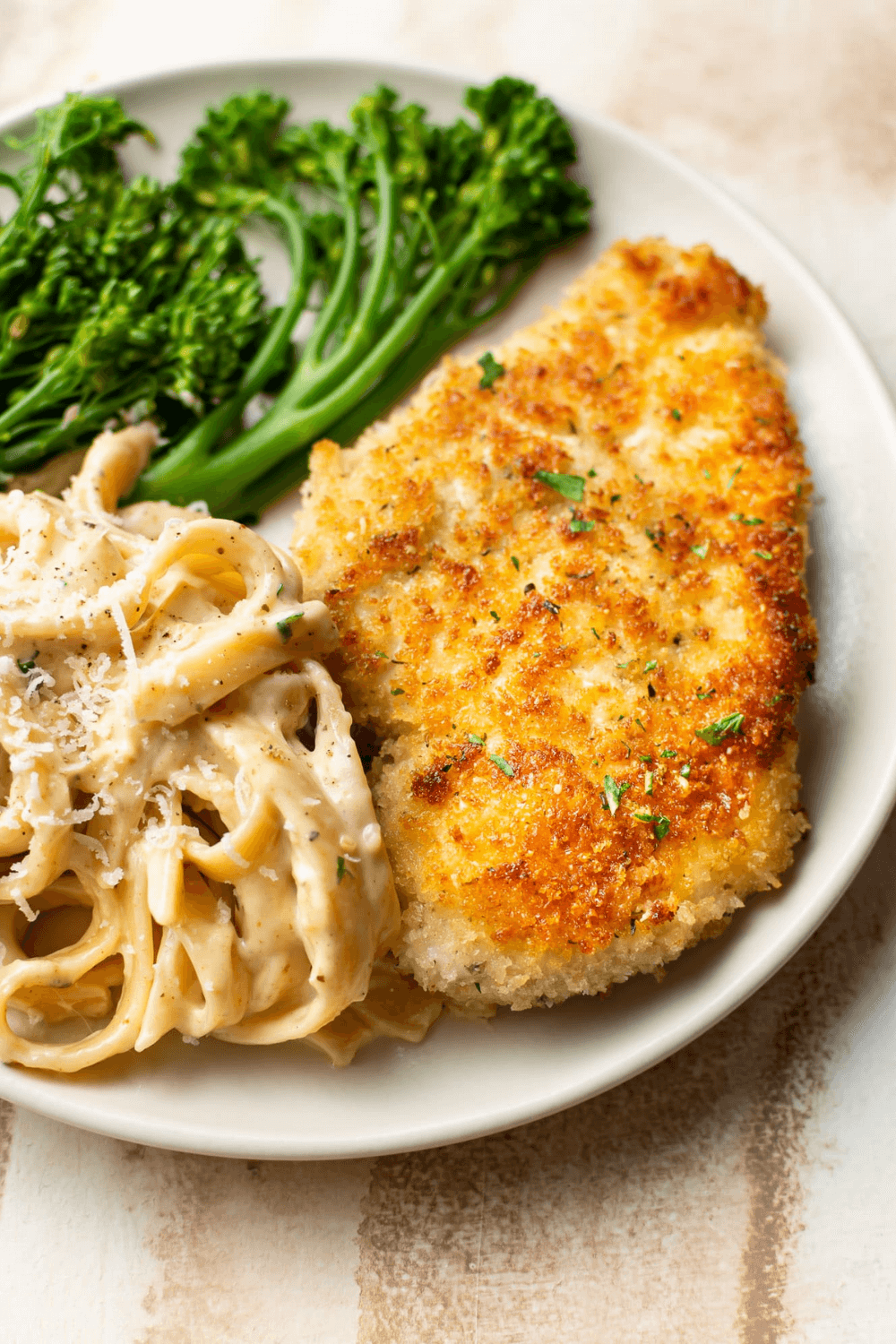 En esencia, el pollo frito crujiente es pechuga de pollo bañada en pan rallado, leche y más pan rallado antes de freírse en aceite caliente. Por lo general, antes de servir, compartían pollo frito con parmesano rallado, y se solía servir con pasta, lasaña o ensalada fresca. Este plato proviene de la cocina italiana.
