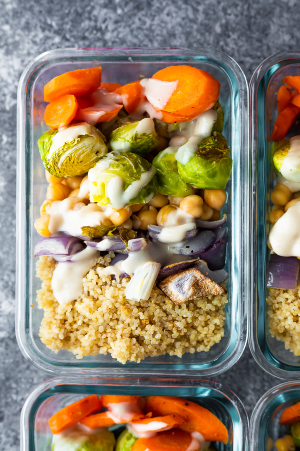 Entre los cuatro recipientes de preparación de comidas, distribuya los garbanzos, las verduras y la salsa tahini (puede condimentarlos inmediatamente o agregarlos a un recipiente de condimentos para agregarlos frescos).