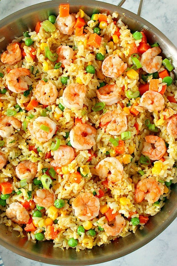 Me gustaría saber qué tan fácil es preparar comida para llevar en casa cuando estaba en la universidad. ¡Mi dieta hubiera sido mucho mejor! ¡Este arroz frito con camarones es uno de los platos más rápidos y simples que puede preparar y que sabe directamente del restaurante! Este plato es perfecto para las sobras de arroz. Siempre cocino más arroz del que necesito y congelo las sobras. ¡El arroz frito se prepara mejor con arroz frío!