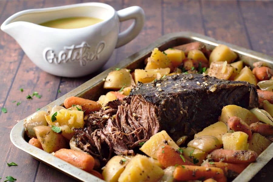 ¡Esta simple cena de asado en olla de cocción lenta sabe muy bien e incluye una rica salsa cremosa! Las tiernas papas, zanahorias y cebollas se cocinan lentamente con un suculento rosbif picado y se rocían con una deliciosa salsa marrón.
