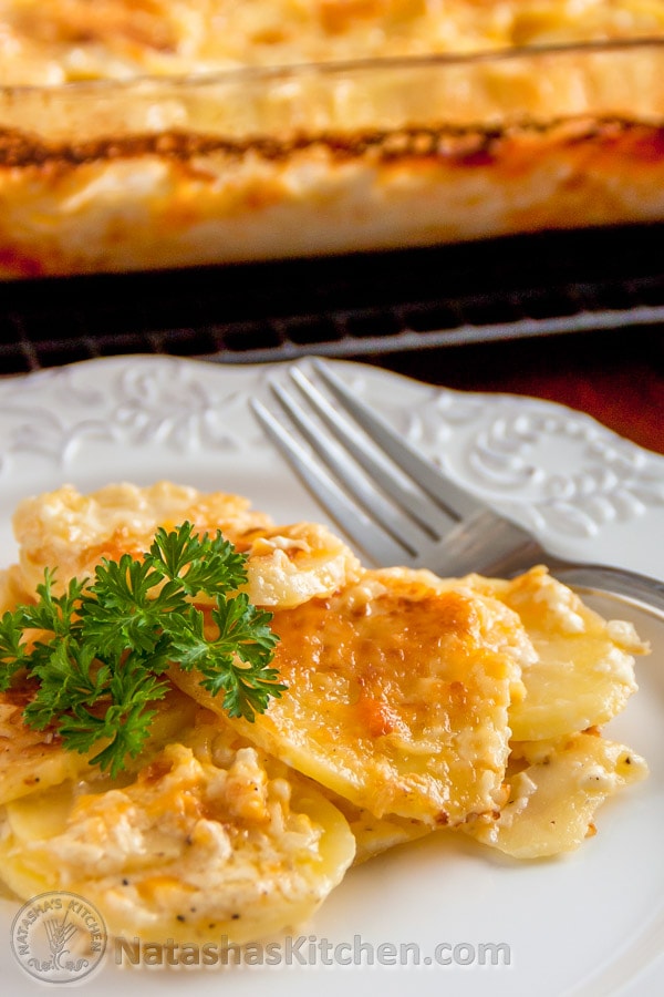 Verter la nata sobre las patatas y empujar las patatas hacia abajo para sumergirlas en la nata. No estarán completamente cubiertos de crema y eso está bien. Cubra el plato con papel de aluminio y cocine en la rejilla central del horno durante 1 hora. Luego retire el papel aluminio y cocine por otros 30-45 minutos hasta que la parte superior esté dorada y burbujeante y las papas hayan absorbido la mayor parte del líquido. Si las papas se doran demasiado rápido, envuelva la plancha en papel de aluminio y continúe cocinando. Las papas deben ser fáciles de perforar con un tenedor cuando estén listas.