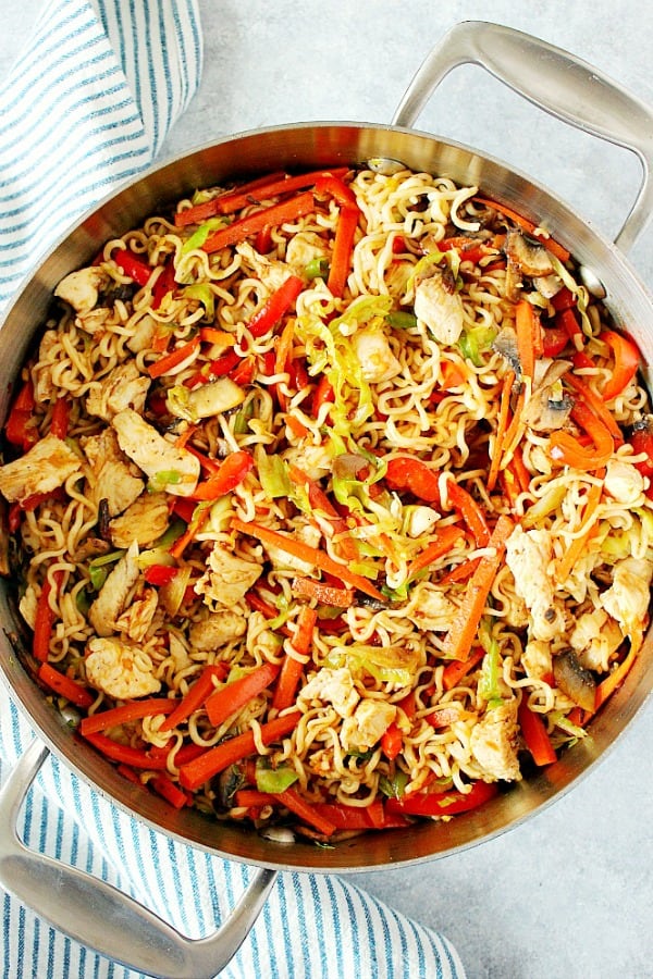 Un plato rápido y fácil con fideos asiáticos, pollo, salsa yakisoba casera, zanahoria, col, pimiento y champiñones. Lleno de sabor, ¡este plato es perfecto para los días de semana!