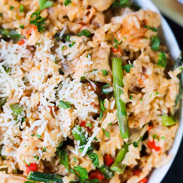 Te encantará esta receta rápida y fácil de risotto de pollo. Esta sencilla receta de risotto de pollo a la parmesana está lista en menos de 30 minutos y a todos les encanta.