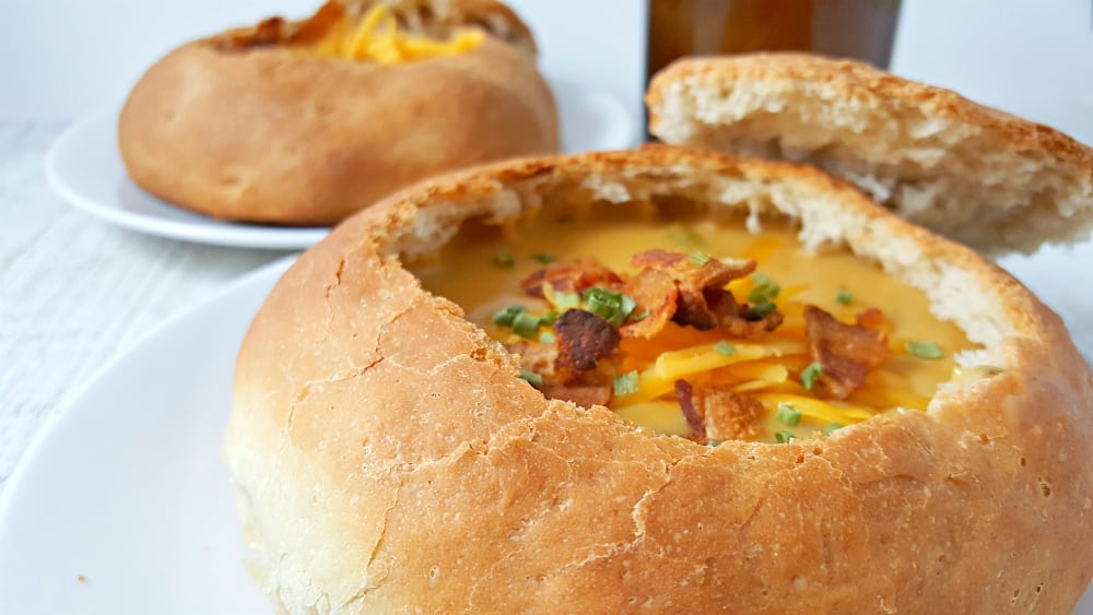 Estos tazones de pan caseros fáciles son esponjosos y livianos y están llenos de una deliciosa sopa o salsa. Son fáciles de hacer y el pan del interior se puede usar para mojar o hacer picatostes caseros.