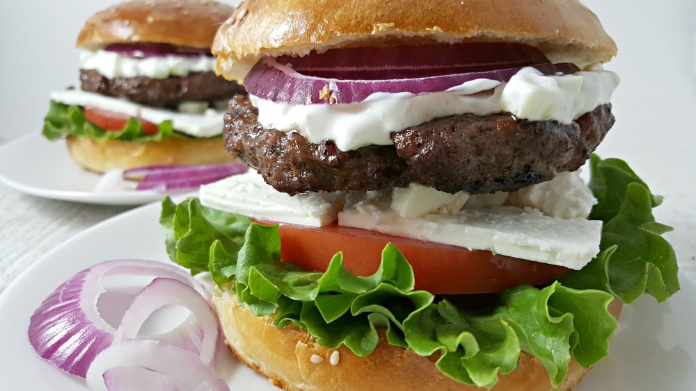 Las hamburguesas griegas con queso feta son grandes, deliciosas, jugosas y carnosas, cubiertas con lechuga, tomate, queso feta, cebolla morada y salsa cremosa de pepino.