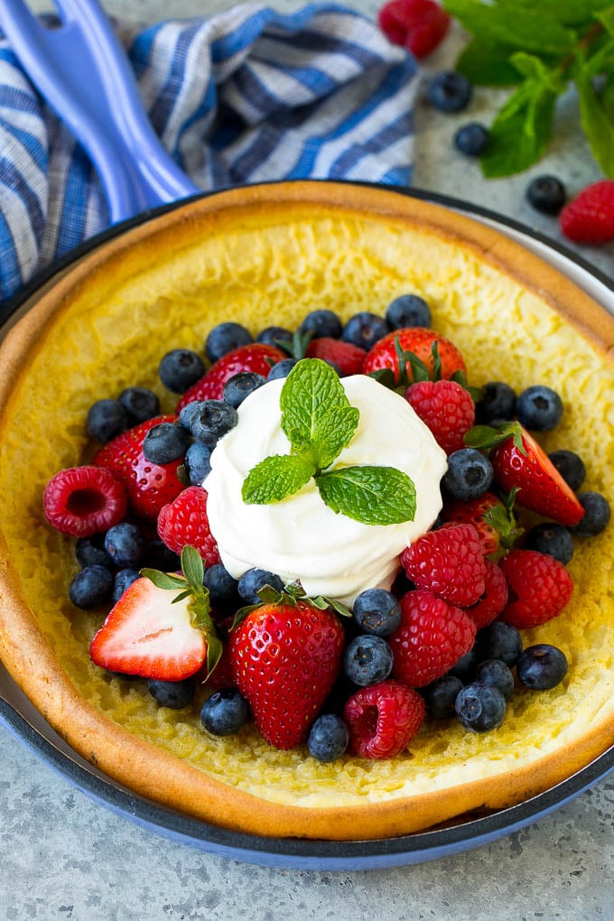 Esta receta holandesa para niños es un panqueque gigante cocinado en una sartén, luego cubierto con fruta fresca y crema batida. ¡Una opción de desayuno o brunch simple y decadente, perfecta para alimentar a la multitud!