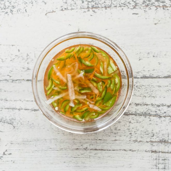 Luego puedes diluirlo con un poco de agua para que las cosas sean menos intensas si lo deseas. Por último, añade una zanahoria rallada, un rábano daikon y un pimiento rojo picado.