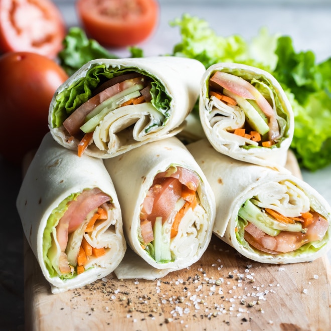 Por cierto, los sándwiches wrap son perfectos para viajes por carretera, días locos, almuerzos escolares, almuerzos de negocios en la recepción, refrigerios rápidos, cenas ligeras, días de campo, días en la playa, descansar junto a la piscina, caminatas y todo lo demás.