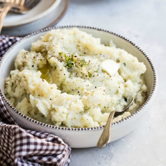 Definitivamente puedes hacer tu receta favorita de puré de papas con un poco menos de calorías. Simplemente reemplace la mitad de las papas requeridas con coliflor. Reduzca el líquido en su receta de puré de papa en consecuencia, ya que la coliflor no requiere mucho líquido. Si lo intentas, ¡cuéntame cómo te fue en los comentarios a continuación!