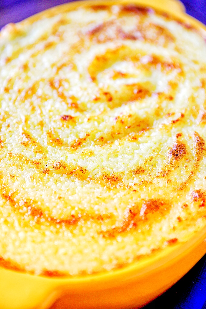 Después de triturar las papas y mezclarlas con la mezcla de mantequilla y crema, use una cuchara para crear un remolino en espiral sobre las papas. Jugar con él. Cuanto más profundos sean los remolinos y más tiempo permanezcan las papas debajo de la parrilla, más pronunciado será el diseño.