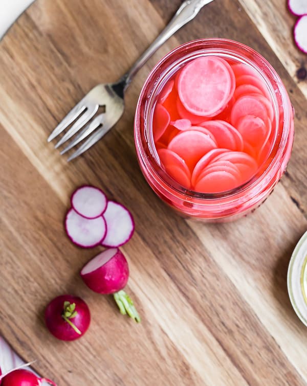 Dada la gran popularidad de mi receta de cebolla roja en escabeche, quería ofrecer artículos en escabeche más fáciles. Esta receta rápida de rábanos en escabeche podría ser mi nueva fiesta. Lo mejor de estos rábanos en escabeche es que puedes usarlos prácticamente en cualquier lugar donde uses una cebolla en escabeche. Son similares en sabor, solo un poco menos que las cebollas.