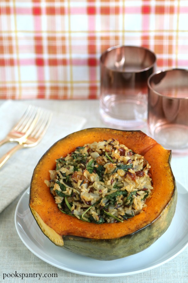El relleno de arroz salvaje se cocina mientras la calabaza se asa en el horno. Cuando la calabaza esté cocida, el relleno estará listo. Solo llena la calabaza y deja que se hornee por unos minutos más.