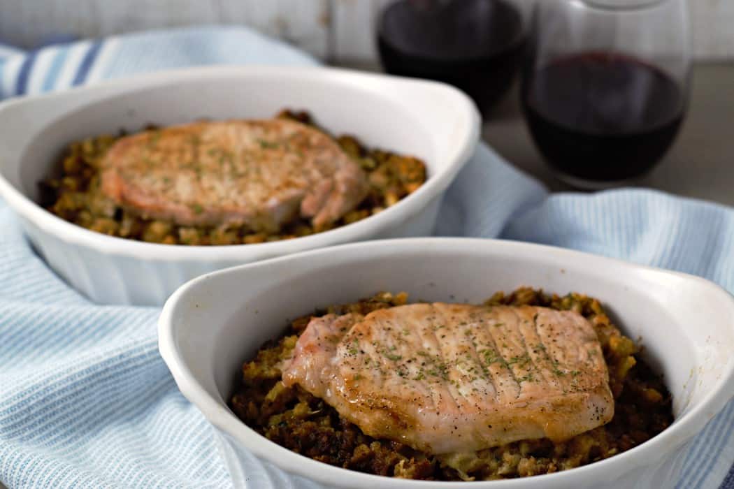 Coloque una chuleta de cerdo en cada montículo de relleno.