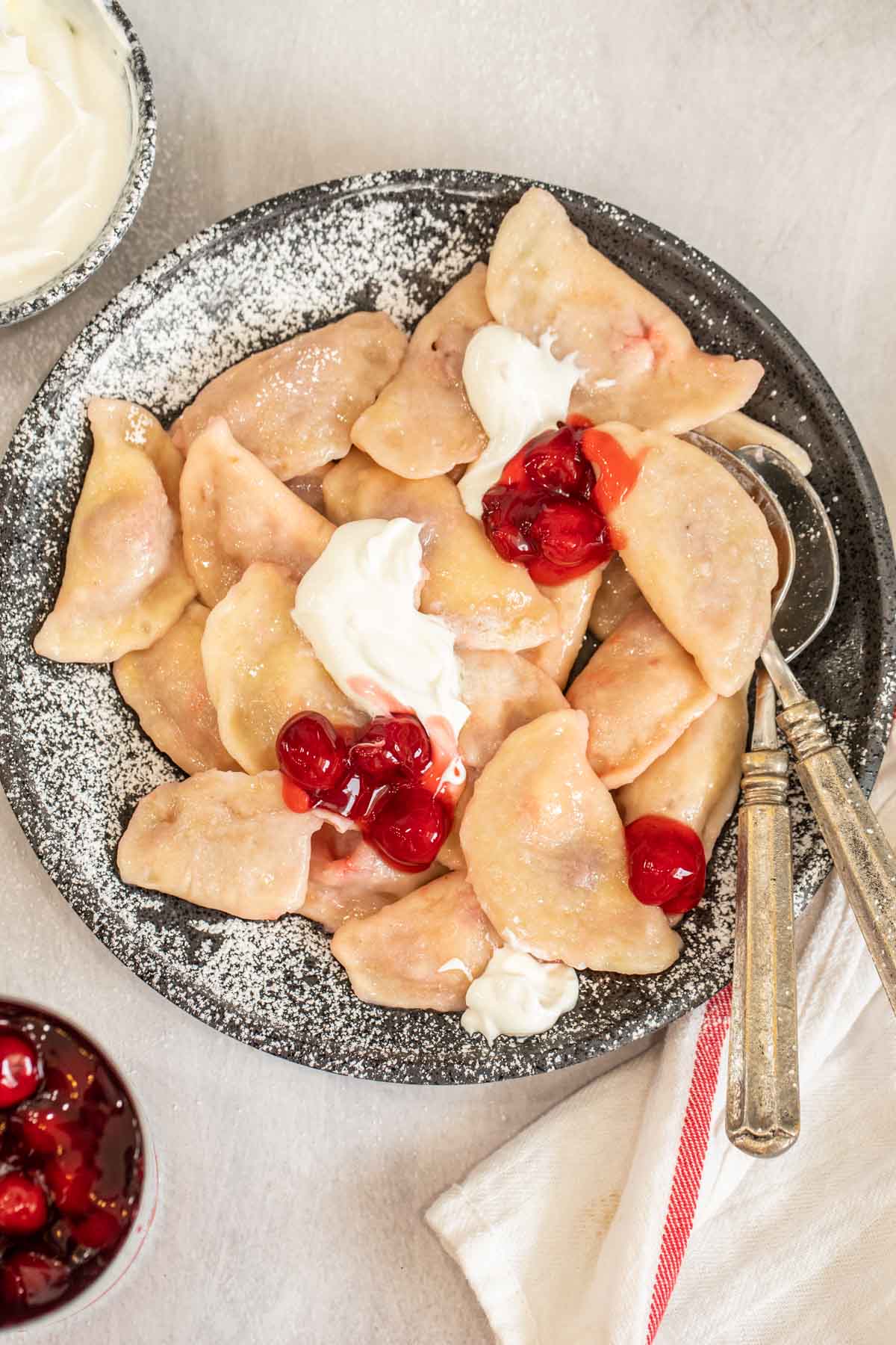 ¡Estos vareniki caseros de cerezas dulces son tan deliciosos y un clásico plato ucraniano! Empanadillas dulces rellenas de queso crema y relleno de cerezas. Se hierven y se rocían con mantequilla, ¡qué bueno!