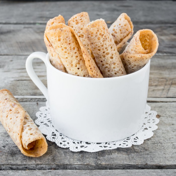 Trabajando rápidamente, instantáneamente envuelve cada galleta rápidamente alrededor del mango de una cuchara de madera, formando un cilindro suelto. Si las galletas comienzan a endurecerse, regrese al horno por 1 minuto para que se ablanden.