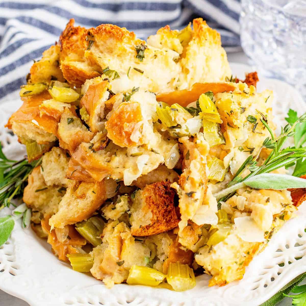 ¡Este relleno fácil de ajo y hierbas es una deliciosa guarnición navideña que utiliza ingredientes frescos para obtener el máximo sabor!
