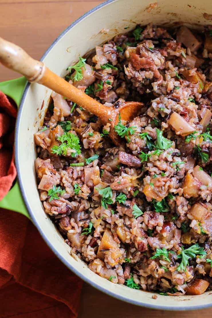 Relleno de arroz salvaje con calabaza, nueces y arándanos secos. ¡Esta saludable receta de relleno sin gluten es perfecta para compartir durante las vacaciones!