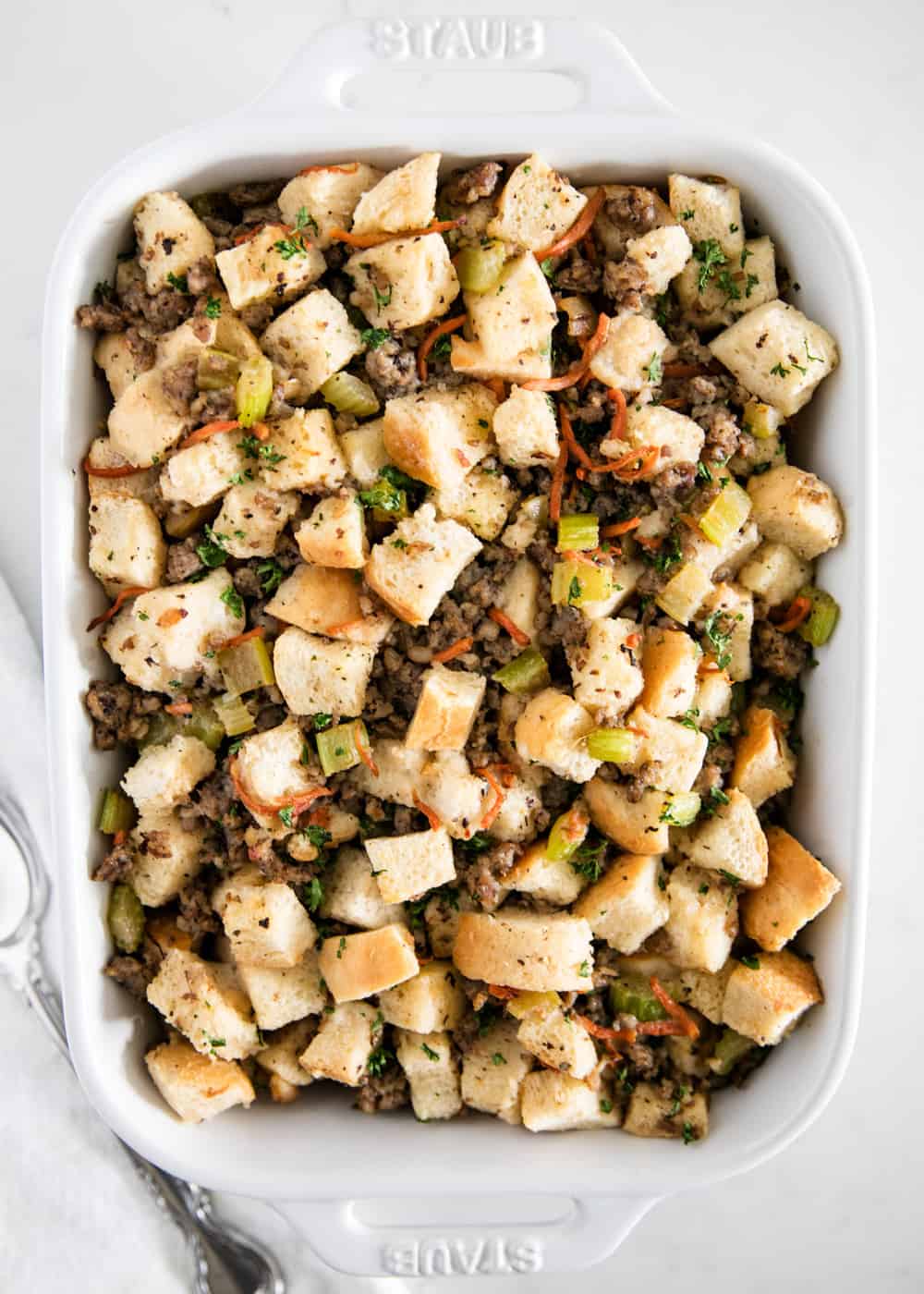 ¡Esta es la mejor receta de relleno de salchichas y una de las favoritas de la familia para las fiestas! Sé que técnicamente es una guarnición porque no me gusta ponerlo en pavo, pero seguro que podrías hacerlo. Si lo voy a poner dentro del pavo, no le pondría la salchicha.