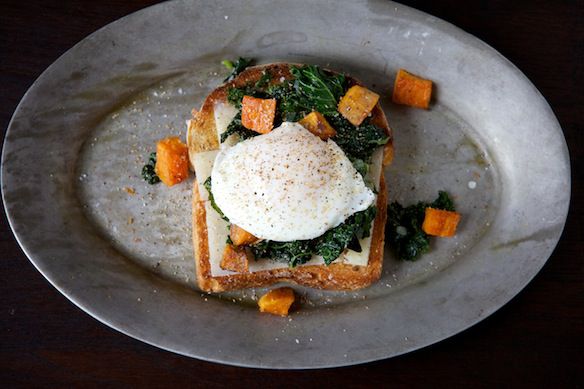 Este es el desayuno perfecto si sientes que te has pasado, especialmente con los pasteles, pero aún quieres algo reconfortante y abundante. Trozos de batata asados en un poco de jarabe de arce y col rizada marchita con cebollas y cebolletas forman un nido para un huevo escalfado suave, y todo se posa sobre una gran rebanada de pan tostado con capas de pecorino picante. Cuando cortas el huevo, la yema se convierte en una salsa sedosa para todos los demás elementos. – A&M: los editores