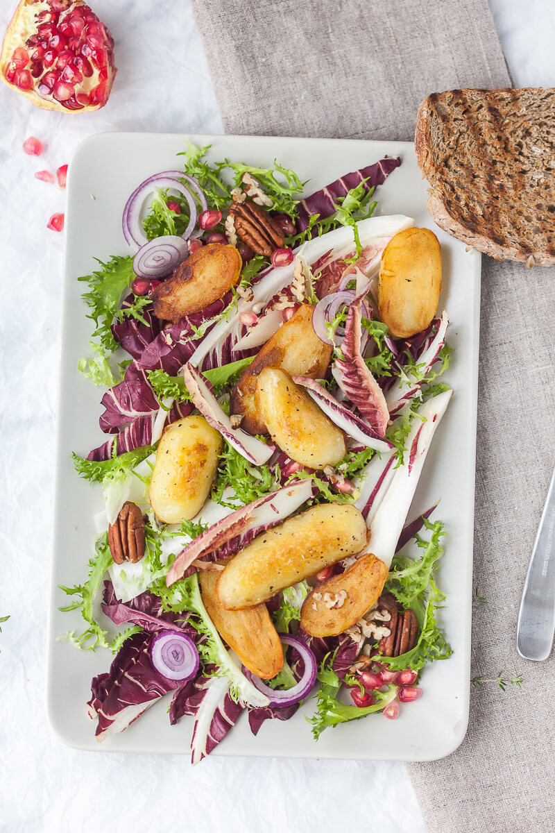 - Mientras tanto, lavar y secar las hojas de achicoria y escarola y cortarlas en tiras. Pelar la cebolla y cortarla en rodajas finas. Colocar las hojas de ensalada en un plato o bol, añadir los aros de cebolla, las nueces picadas, las semillas de granada y espolvorear con la vinagreta de limón. Cubra con papas asadas y sirva.