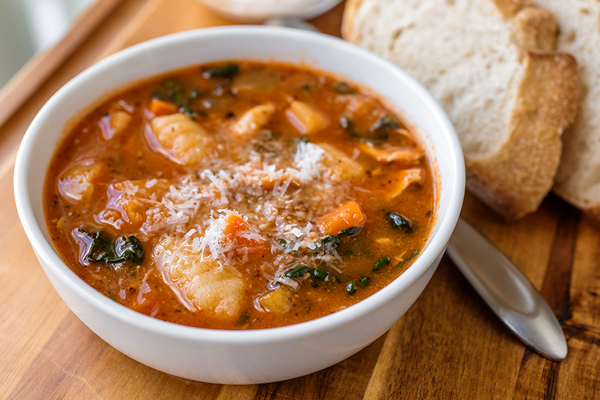 Sopa Italiana de Pollo y Verduras de Otoño con Ajo Asado y Caldo de Tomate sobre Ñoquisdesde