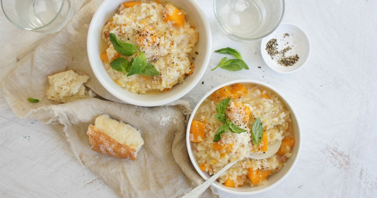 Coloque el arroz, el caldo, la mantequilla, la calabaza, la cebolla y el tocino en una bandeja para hornear y revuelva suavemente para combinar.