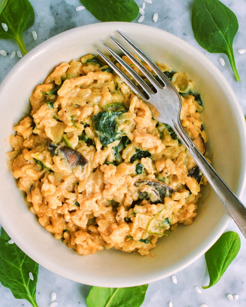 También agregué espinacas y champiñones salteados, porque no sería una receta de Nutrir con Kristine sin algunas verduras. También soy un loco amante de los hongos, pero si no eres un gran fanático, definitivamente puedes omitirlos. O puedes reemplazarlos por otra verdura. Las coles de Bruselas o los espárragos probablemente sabrán bien en este risotto.