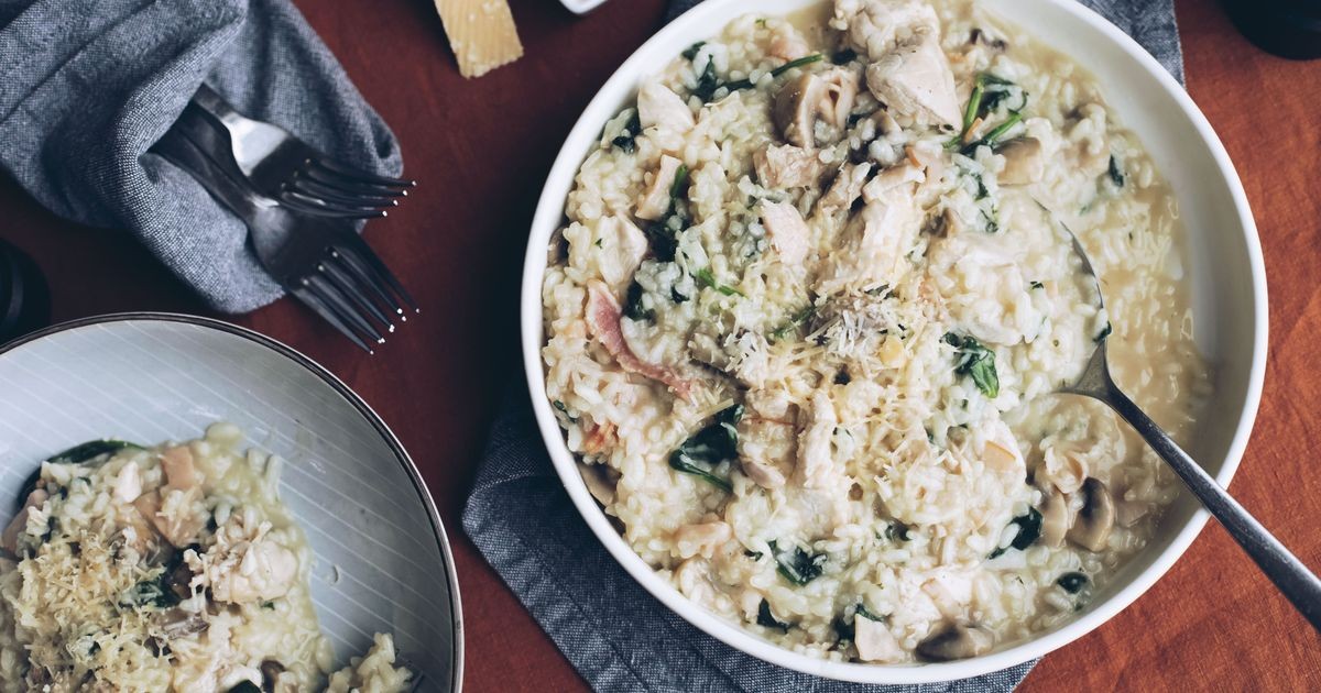 Después de la adición final del caldo, agregue el pollo, el tocino, los champiñones, las espinacas y el queso.