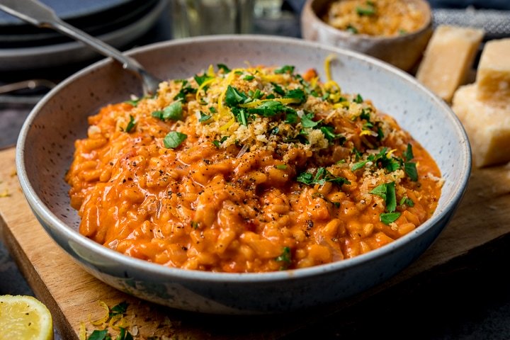 Risotto cremoso de tomate con migas de ajo crujientes