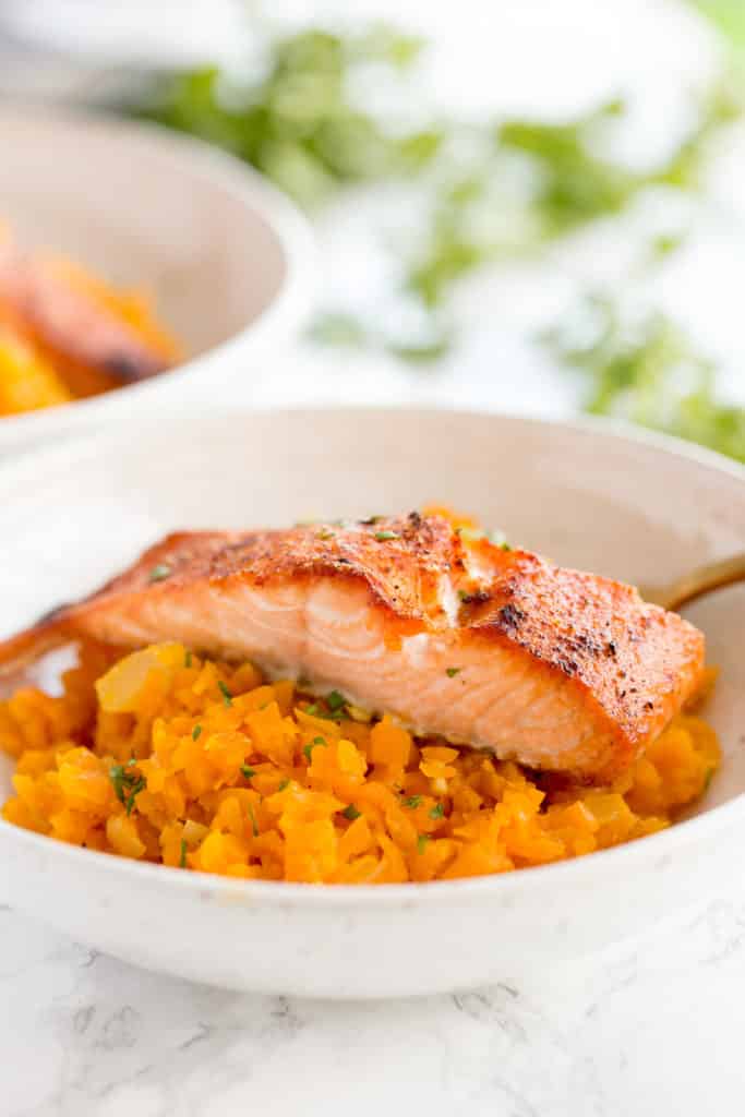 - Cuando el salmón esté cocido, divida la mezcla de calabaza en tazones y agregue el salmón. Adorne con perejil, si lo desea.