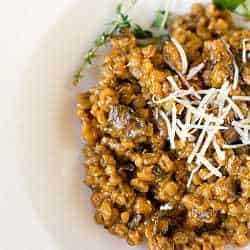 Me encanta el risotto. Como risotto El risotto con chorizo ​​y champiñones que preparo desde hace años es una de mis divisiones favoritas. Me encanta lo suave y cremoso que es el arroz Arborio, lo rico que es el plato y cómo se combinan tan bien todos los sabores complementarios. Tiendo a no hacer esto muy a menudo, ya que normalmente no como arroz blanco, ni como salchichas italianas regularmente (¡ambos son definitivamente deliciosos!). Entonces, mientras navegaba por algunos blogs y encontré esta receta de risotto que usa cebada en lugar de arroz arborio, rápidamente me di cuenta de que encajarÃa perfectamente con mi nuevo plan de comer más granos y verduras. ¡Bloquear!