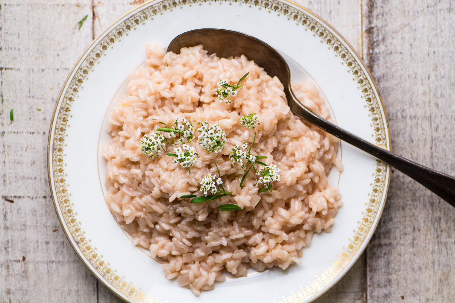 Hubo un tiempo en que se burlaban sin piedad de ti por beber Rosé, pero ya no. Es genial ahora, y me alegro de haber sido siempre un fan. El vino rosado es en realidad un vino tinto, elaborado con uvas rojas. Es ese hermoso color rosa pálido porque los enólogos solo dejan que las pieles se empapen en el jugo por un corto tiempo. El rosado es un cóctel refrescante, pero también es un ingrediente versátil en otras recetas. Lo uso como base para este inusual risotto rosado.
