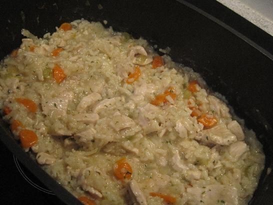 Agregue las zanahorias, el apio, el arroz y el pollo y mezcle durante 1 minuto, asegurándose de que el arroz esté cubierto de aceite.