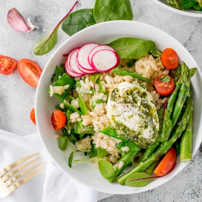 Risotto cremoso, cubierto con espárragos, tirabeques, tomates y rábanos, cubierto con crema fresca y pesto. ¡Tan bueno!