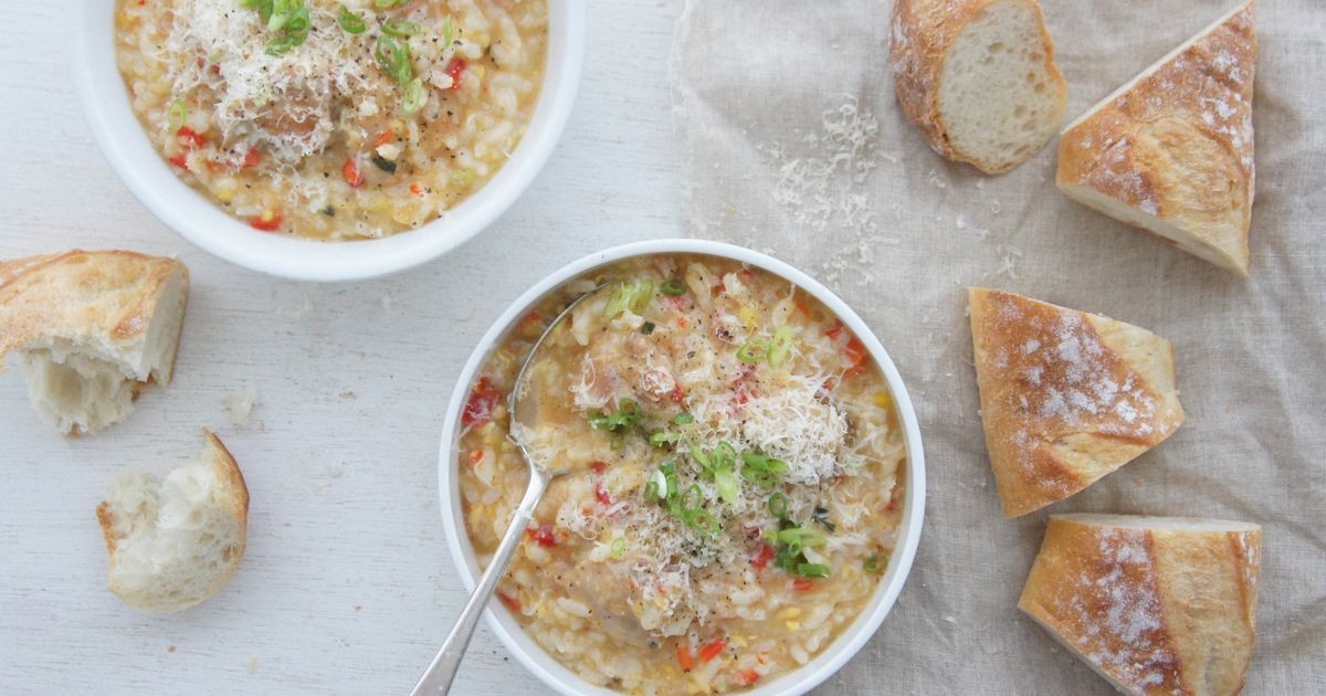 Coloque la mantequilla, el tocino, las cebolletas, el ajo, el arroz, el pollo, el pimiento, el caldo y la pimienta en una cacerola grande (más 6 tazas) y revuelva para combinar.
