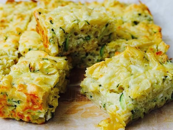 Coloque la pasta cocida, el calabacín, la ricota, 1 taza de queso cheddar, aceite, huevos, 1 taza de harina y sal en un tazón grande y revuelva con una cuchara hasta que se mezclen.