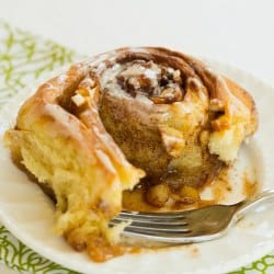 Hice dos versiones diferentes de rollos de canela caseros: la versión de Peter Reinhart y la versión para untar con queso crema. De los tres, este se ha convertido en mi favorito. Puede convertirlo fácilmente en un rollo de canela para todo uso omitiendo la salsa de caramelo salado y las manzanas y dejando todo igual.