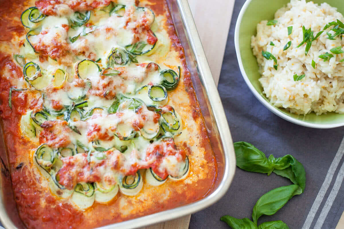 - Cuando los rollitos de lasaña de calabacín estén cocidos, retíralos del horno, colócalos en un plato, cubre con unas cucharadas de salsa de tomate y añade una porción de arroz cocido. Servir caliente.