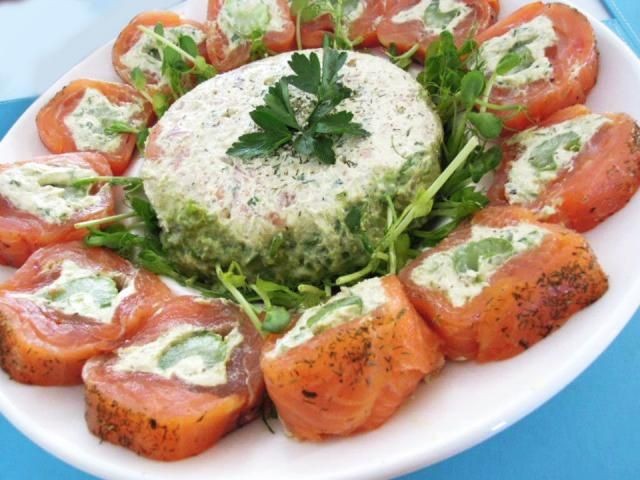 Para hacer la salsa, mezcle el salm贸n ahumado sobrante, el queso crema, el apio, el eneldo, la menta, las cebolletas y el aguacate. Sirva con ensalada, galletas saladas o pan.