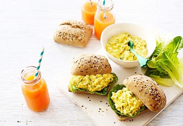 Divida los sándwiches, por la mitad, agregue las hojas rotas, agregue la mezcla de huevo sobrante al curry.