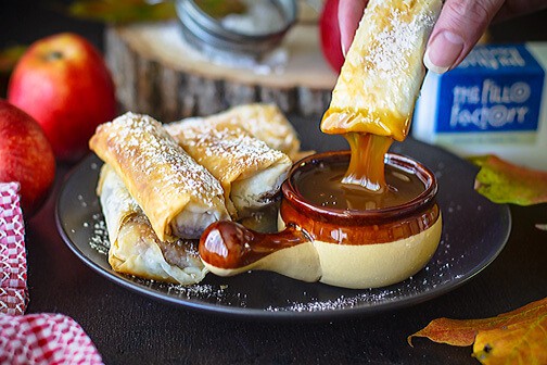 Estos rollos de panqueques están doblados al estilo de un rollo de huevo, pero puedes doblarlos como quieras. Puedes hornearlos en el horno, pero si buscas esa sensación agradable y reconfortante, querrás freírlos. Afortunadamente, no absorben la grasa como suelen hacerlo los salteados, pero se mantienen crujientes y complementan a la perfección lo tierno. relleno de manzana.